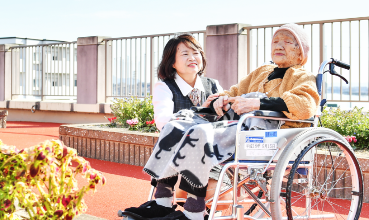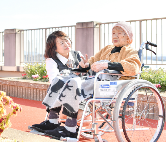 福岡のグッドタイムホーム1・海の中道にお住いの田中カ子さまは明治36年1月生まれの119歳(2022年1月現在)、今もお元気に過ごされています。2018年7月22日に長寿世界一ならびに日本一となり、ギネス認定もされています。